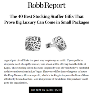 Steven Lagos, founder and Creative Director of this fine jewelry brand, was thinking of his grandparents’ experience with Alzheimer’s disease when he crafted this custom-designed collection. Inspired by the intricate curvature of our Frank Gehry-designed building, this beautiful jewelry can be ordered online and 100% of the proceeds benefit Keep Memory Alive.